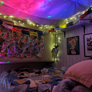 Now to my favourite bit, decor!! I went for a material that had the busiest pattern on, flamingos and palm leafs, because why not? My mum kindly made these into curtains for me by cutting and sewing them onto the original curtains. She also recovered the headboard with this material as well! The ceiling in the bedroom is a brown leather which I have covered with fabric and draped to allow the material underneath to breathe, we used velcro, glue and